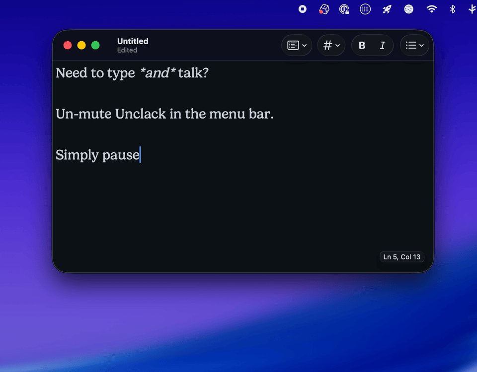 Need to type loudly and talk? Easily pause Unclack from the menu bar and resume later.